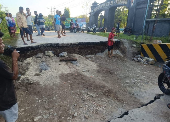 Jembatan Asam Tiga (Tepat di depan Markas Brigif 21/Komodo). Kamis, 26 Maret 2026, pukul 07:00 WITA. Akses jalan tidak dapat dilalui oleh kendaraan roda dua maupun roda empat akibat kerusakan parah/putus total pada struktur penghubung.